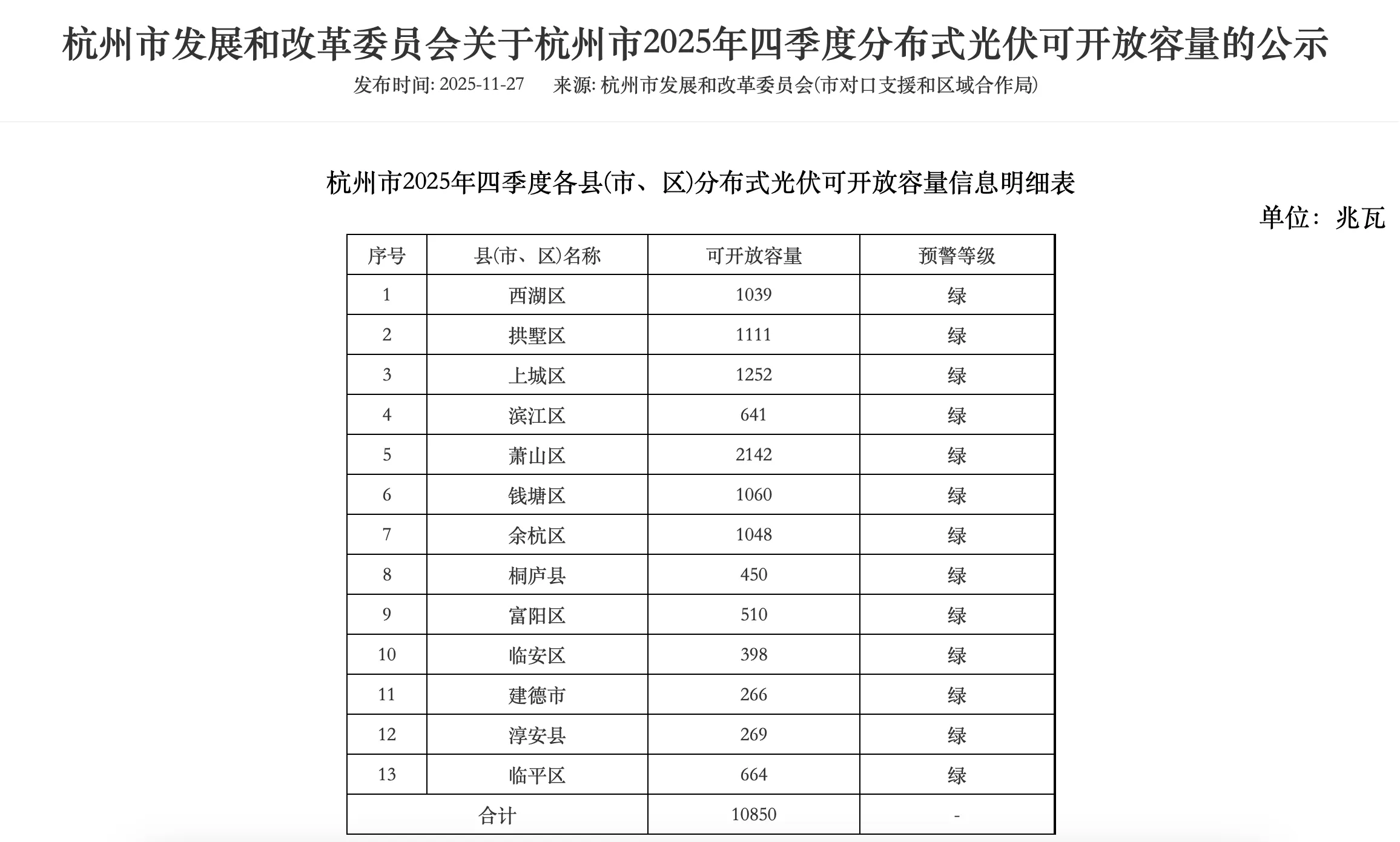 【轨物洞见 】杭州2025年四季度分布式光伏可开放容量公示