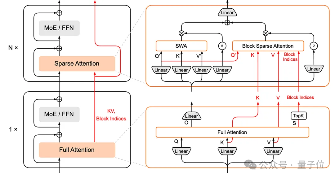 这背后的动机是Full Attention在完成自身计算的同时,已经生成了KV Cache,并且计算出了最准确的token重要性信息,自然可以供后续N个Sparse Attention层直接复用。