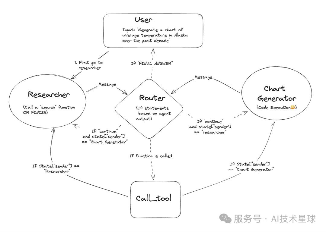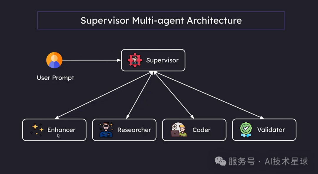 再加一个Supervisor(监督者/路由器):负责决定“下一步该谁上”,以及“返工回到哪一环”。LangGraph 社区也提供了 Supervisor 的参考实现与库。