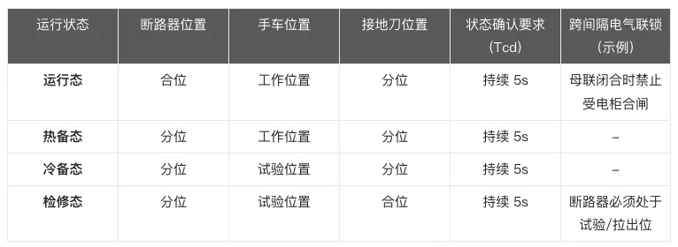 系统依据断路器、底盘车及接地刀的实时物理位置进行逻辑判定。各组件位置必须满足设定条件,并经过持续 5 秒的状态充电时间(Tcd)校核,方可确认状态转换完成。