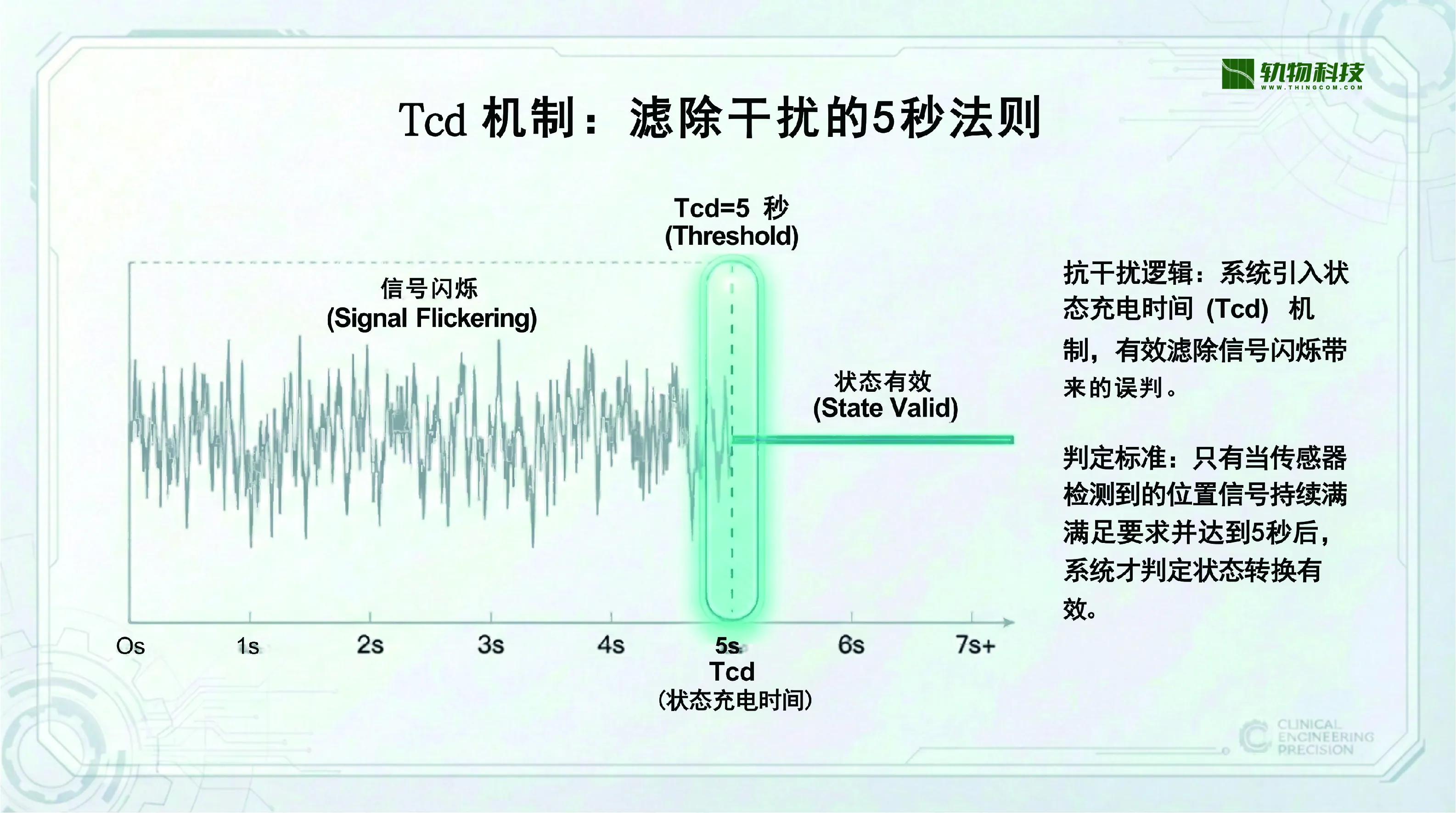 从瞬态物理到确定逻辑的桥梁 :5秒的操作逻辑是为了过滤所有非稳态过程。断路器合分、手车摇进摇出时,物理机构的惯性震动与电荷释放具有明显的瞬态特征。Tcd 强制系统进入 5 秒的“冷静期”,确保物理运动彻底停止、电磁环境恢复稳态。这 5 秒将“概率性到位的物理信号”转化为“百分之百确定的逻辑判据”。